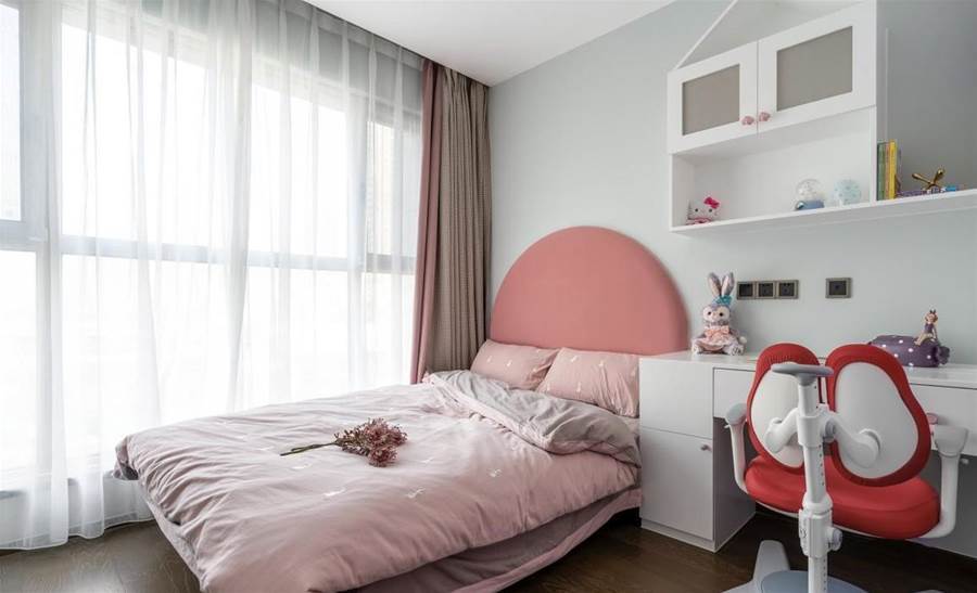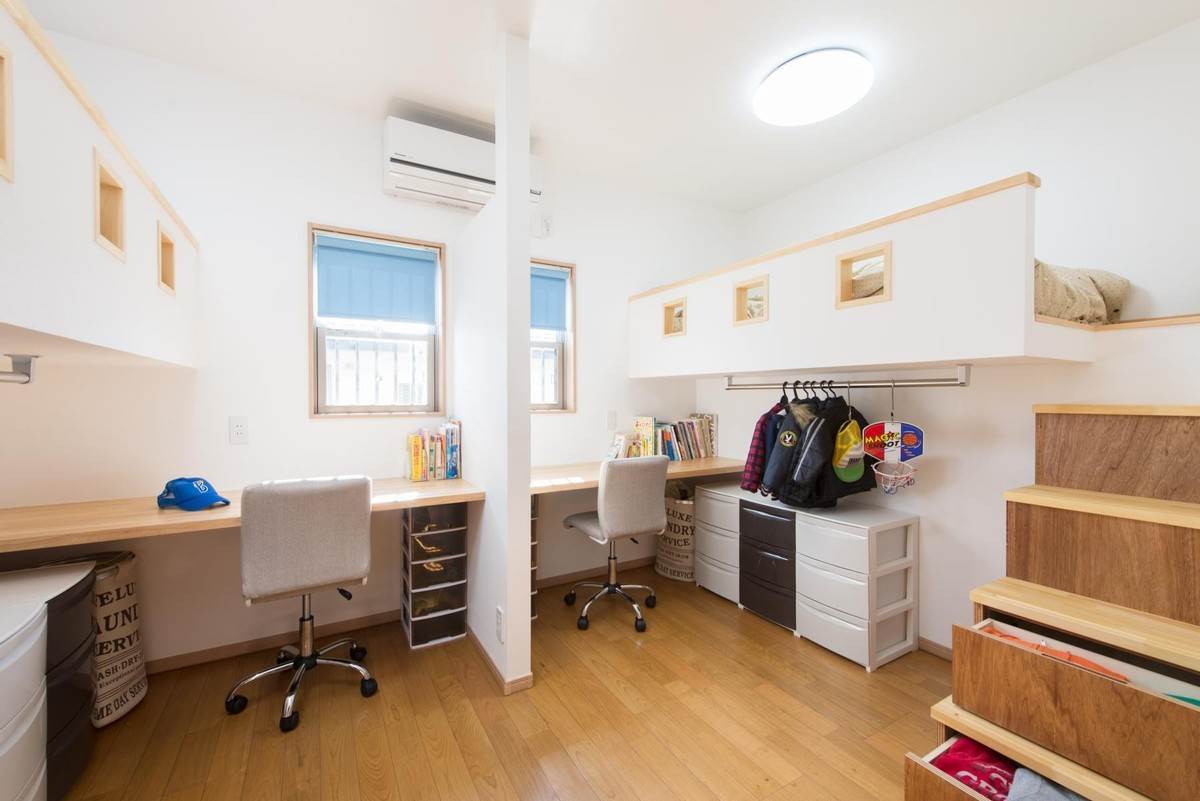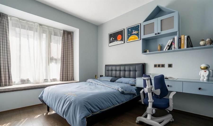 左右相隔就是在房間的中間位置加個隔斷,兩張兒童房靠牆擺放,上床下櫃,中間則是兩張書桌。