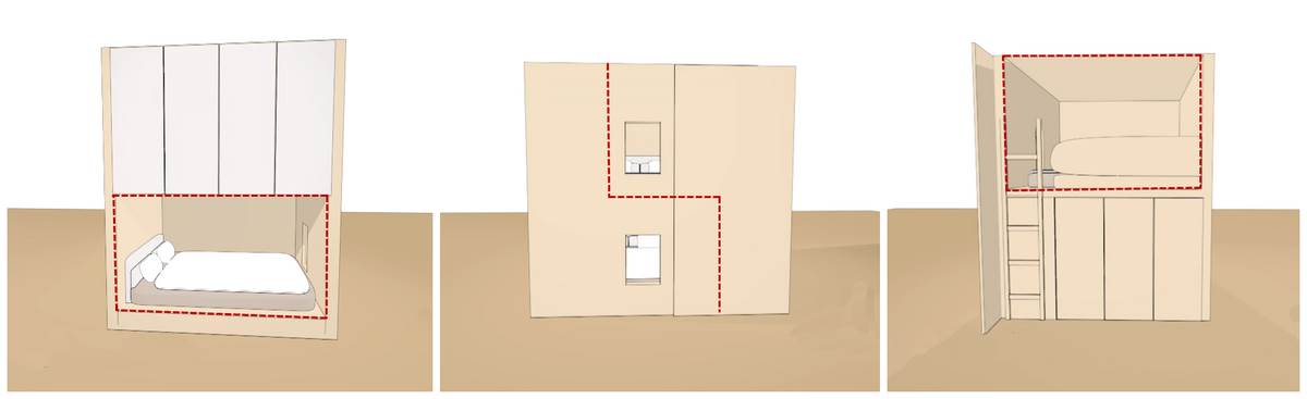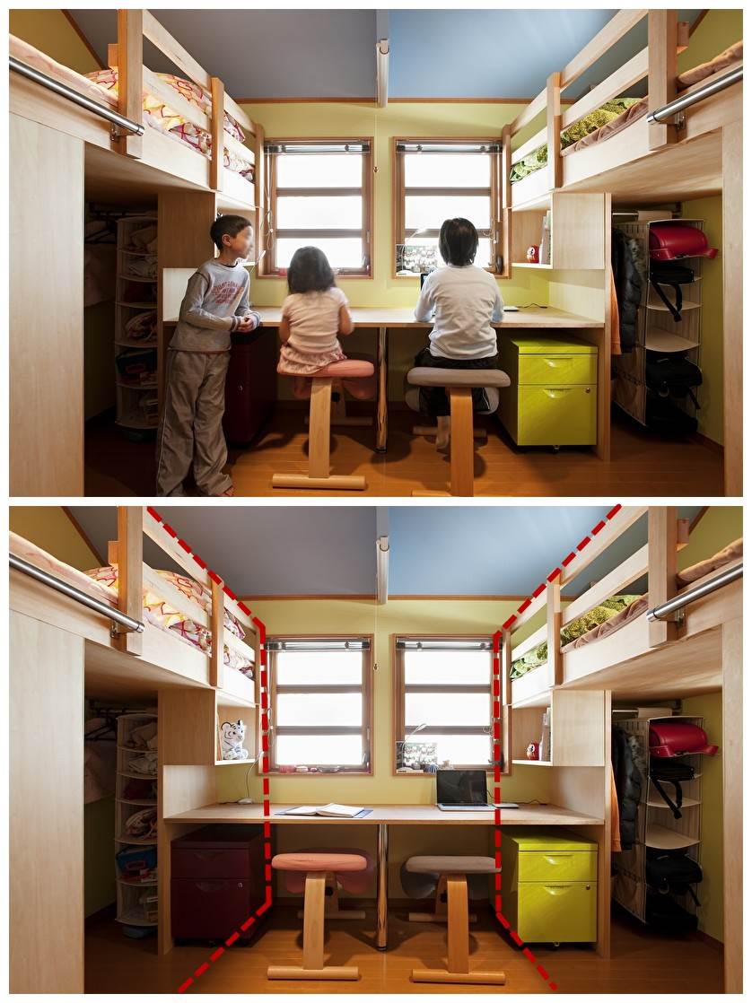 而斜著相隔則是將房間沿著對角線就行隔開,中間利用一張「S」型結構的床來代替隔斷,從左邊看上床下桌,右邊則是下桌上床,《夢想改造家》節目中就出現過這種設計,一張床兼具了兩床兩衣櫃的功能,書桌則是放在兩邊牆壁的角落處。