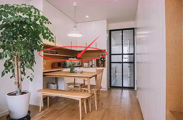 如果感覺室內儲物空間實在是不夠用,其實卡座上方也可以打排柜子,這樣既能儲物,用餐問題也解決了,但是切記上柜高度控制好,不要一站起來就撞到頭。