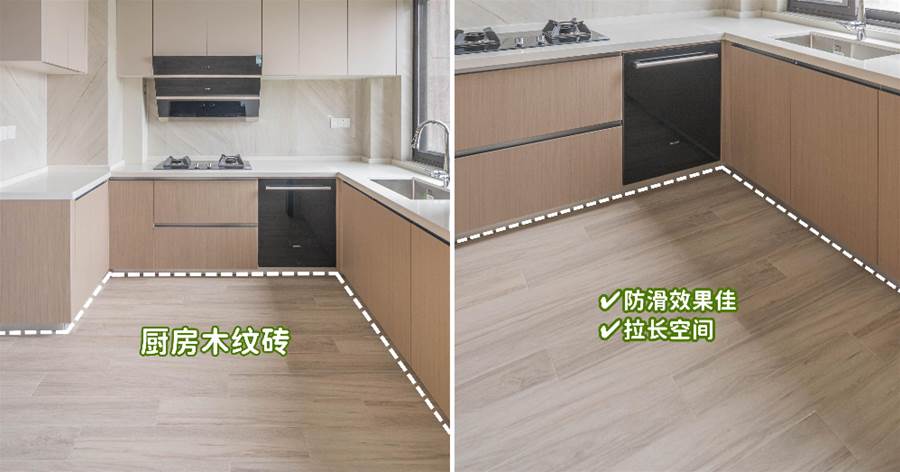 畢竟廚房又是水又是油的,不小心弄在地上,站在上面一不留神就容易摔倒,感覺太不安全了。相比較而言,木紋磚具有一定的防滑作用,特別是家里有老人、小孩的,經常往廚房跑,會安心很多。