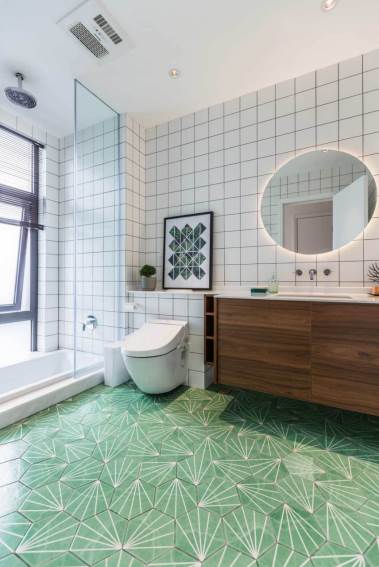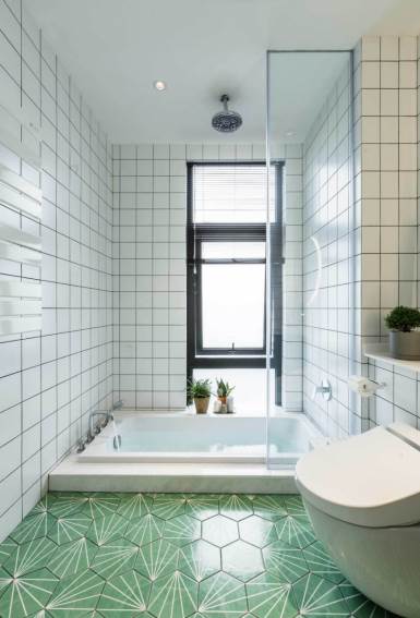 最內側是一個下沉式浴缸,右手邊是壁掛馬桶、入墻水龍頭和壁掛面池,在節省空間的同時,給人一種很高級的感覺。