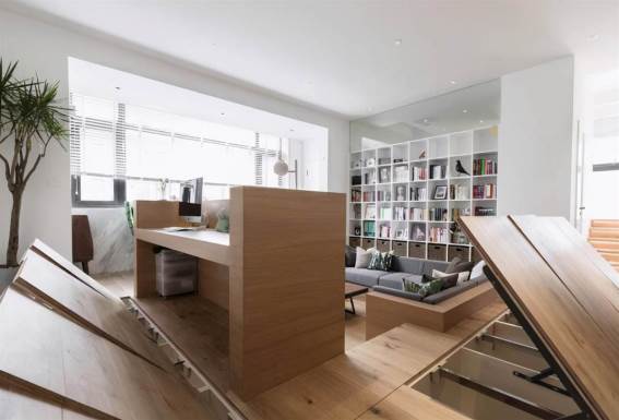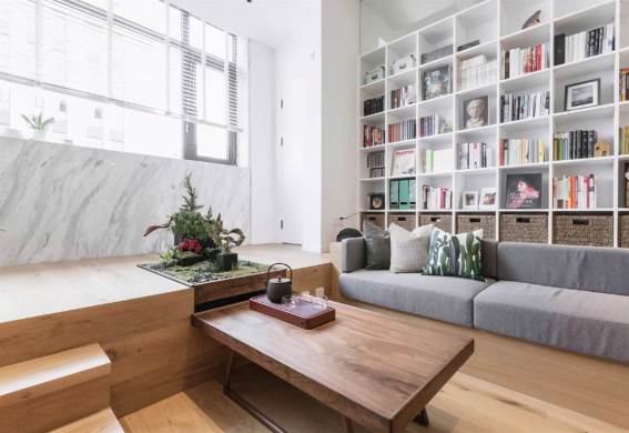 沙發四周高出的部分被改裝成了隱形地柜,極大提升了房間的收納能力,節省了外部空間。