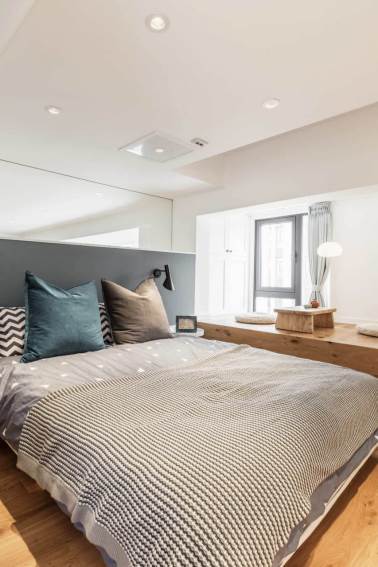 為讓臥室看起來更開闊、通透,我們拆掉了陽臺的隔斷,在床頭安裝了玻璃內墻,將臥室和客廳連接起來。