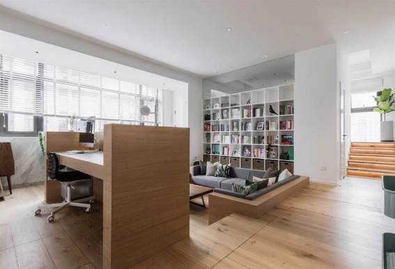 沙發后是一面隔斷書架,將客廳與儲物間分隔開,明確了房間的功能區,提升了客廳的儲物能力,美觀又實用。