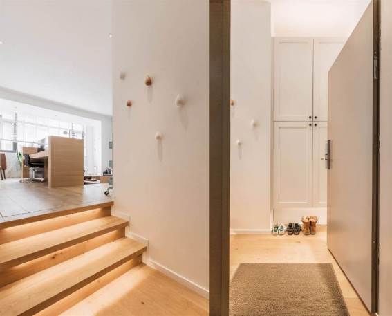 客廳提高50厘米后,正好在玄關部分隔出一個「落塵區」,防止灰塵進入室內。