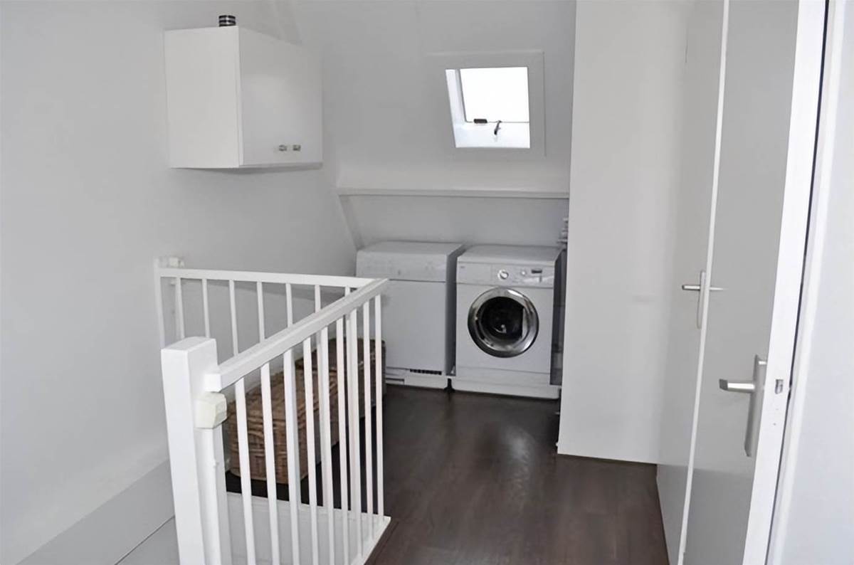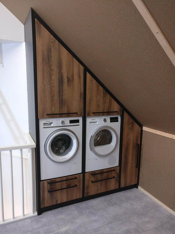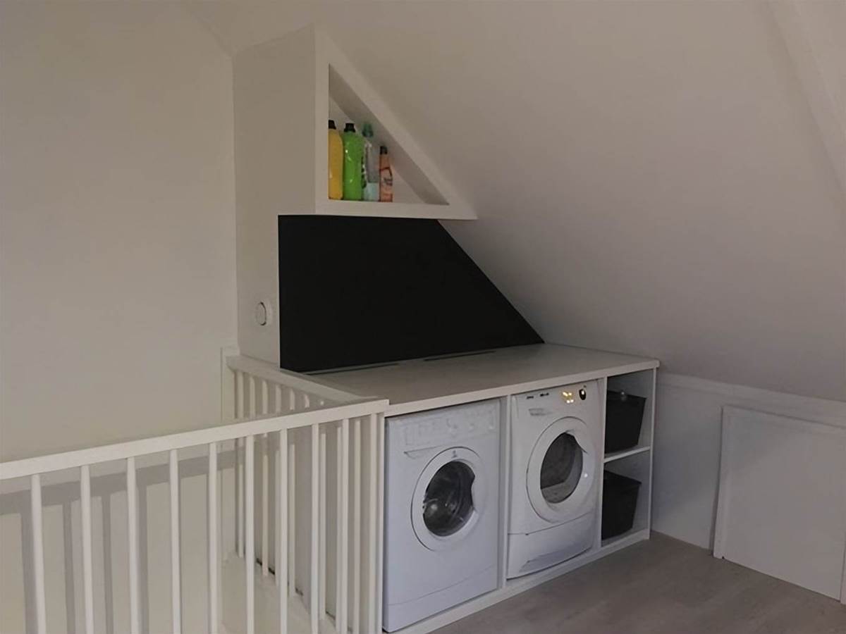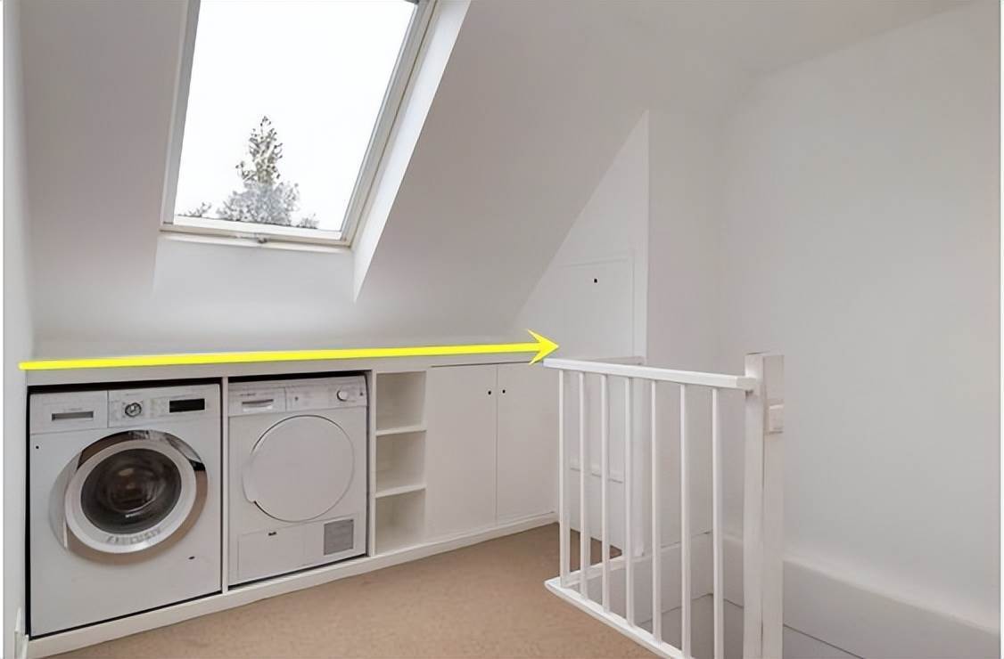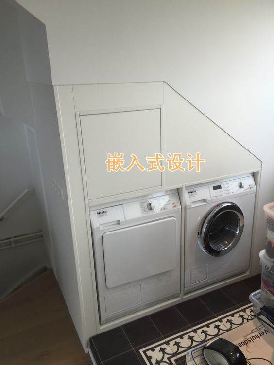 如果說洗衣房的必備要素,那一定是洗衣機、存儲的功能了。沒想到這不到1㎡的空間也能全部實現。樓梯上方的墻面空間利用上,洗衣機直接做嵌入式處理,但要注意,必須是非承重墻才可以。