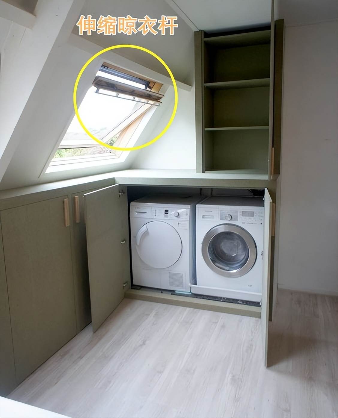 比如像下圖這種,打造一排嵌入式的空間,左側嵌入洗衣機+烘干機,右側一半騰出來打造儲物柜體。如果可以形成基本的步入式空間,還可以給這里增加一排晾衣桿,專門用來晾曬衣物。