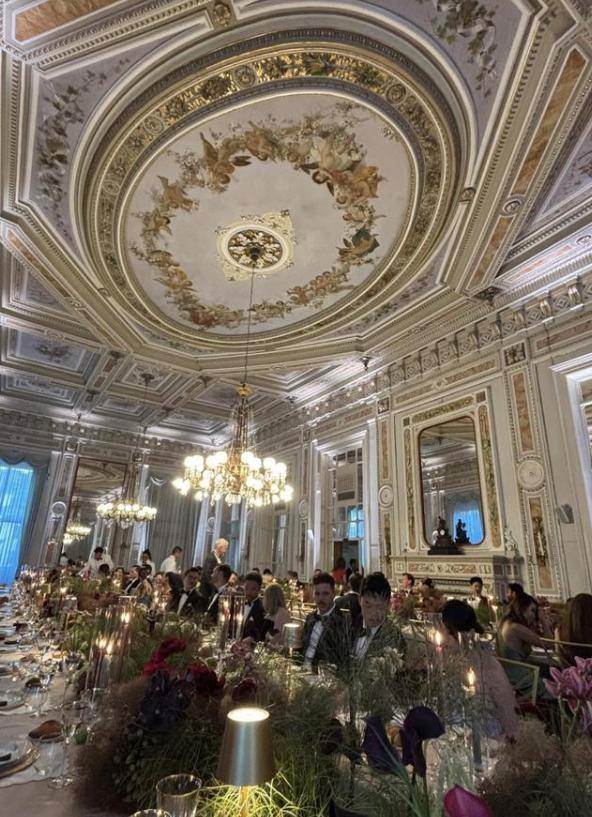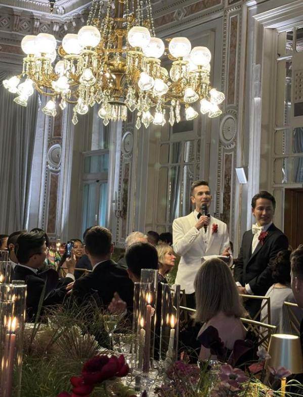 晚上的晚宴移到了酒店裡面,那個宴會廳裝修得很華麗,歐式風格,天花板上有壁畫,水晶燈,長桌宴的形式,桌子上擺滿了鮮花和燭台,氛圍感確實很足,鍾利華換了黑色禮服出來迎賓,兩個人還在台上切蛋糕,他的義大利丈夫還發言感謝來賓,整個流程跟傳統婚禮沒什麼區別。