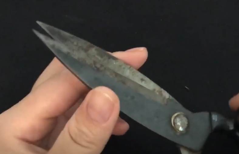 大家看,我們的剪刀有很多的銹跡,剪東西也非常的鈍,接下來教你一招,再鈍的剪刀也能變鋒利。