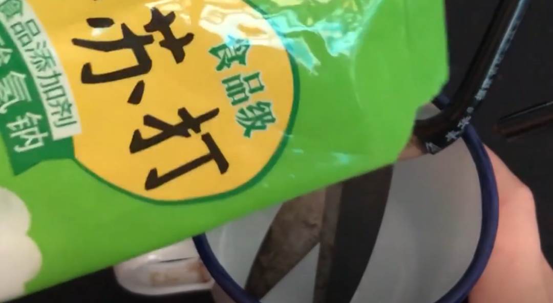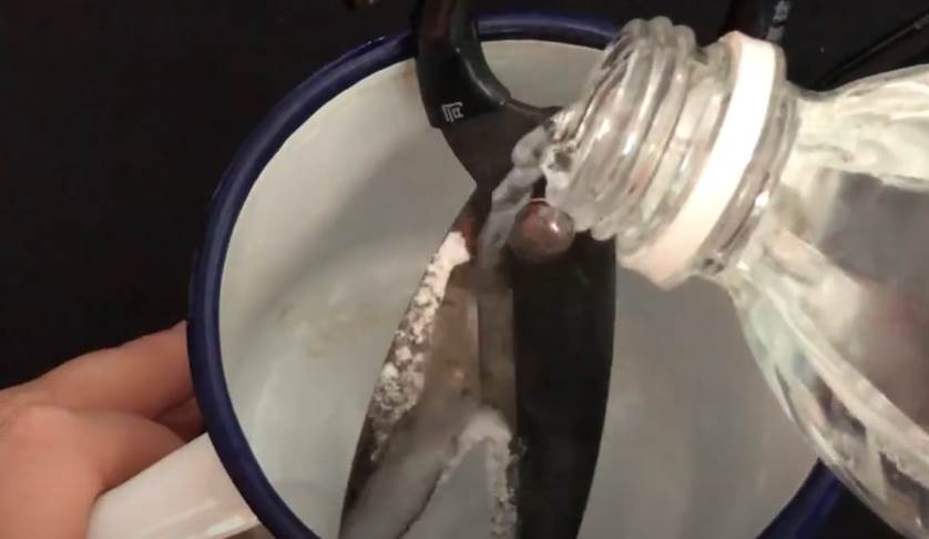 之后我們再倒入一些白醋,小蘇打有強力去污的作用。白醋可以軟化剪刀上的銹跡,兩者會發生反應。
