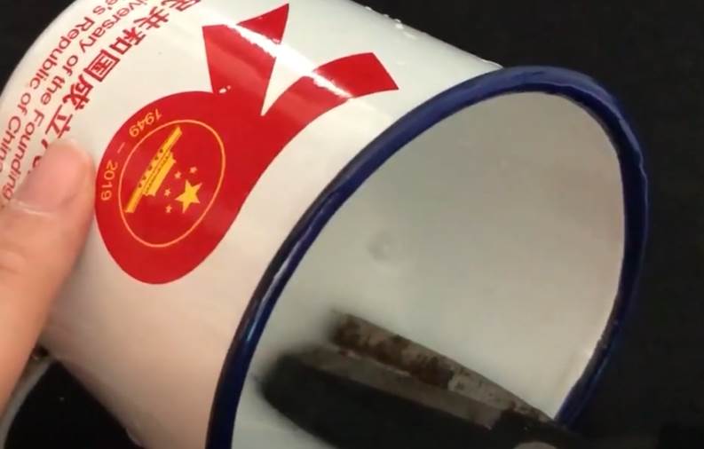 另一邊,也同樣操作,撒上一些小蘇打,然后倒入白醋之后我們將剪刀放在這個溶液里面浸泡十分鐘,十分鐘的時間到了,大家看一下,溶液已經變得很黃了,剪刀上很多明顯的污漬也已經掉下來了,這時候,我們準備一個瓷碗,然后將它翻過來倒置。